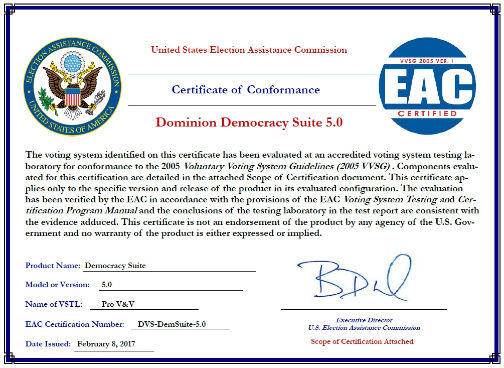 Regardless, Pro V&V, according to the NVLAP and the EAC, was never out of compliance with standards and the lab’s accreditation was never in jeopardy. Clerical errors mixed with staffing cuts during a pandemic are all that are to blame for the certificate debacle. Elections were not affected and democracy was not threatened by this situation.