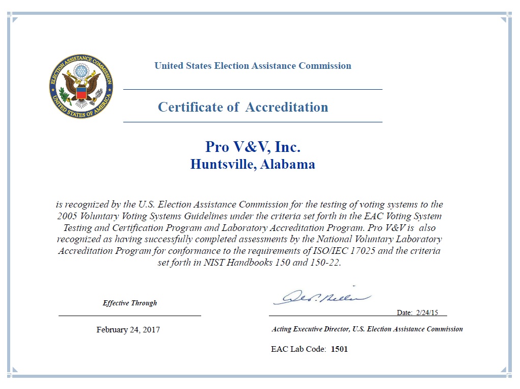 An accredited lab can voluntarily surrender its accreditation from the NVLAP, have that certificate suspended due to some failure identified during assessments, or have their accreditation revoked by the Election Assistance Commission (EAC). This isn’t what happened to Pro V&V.