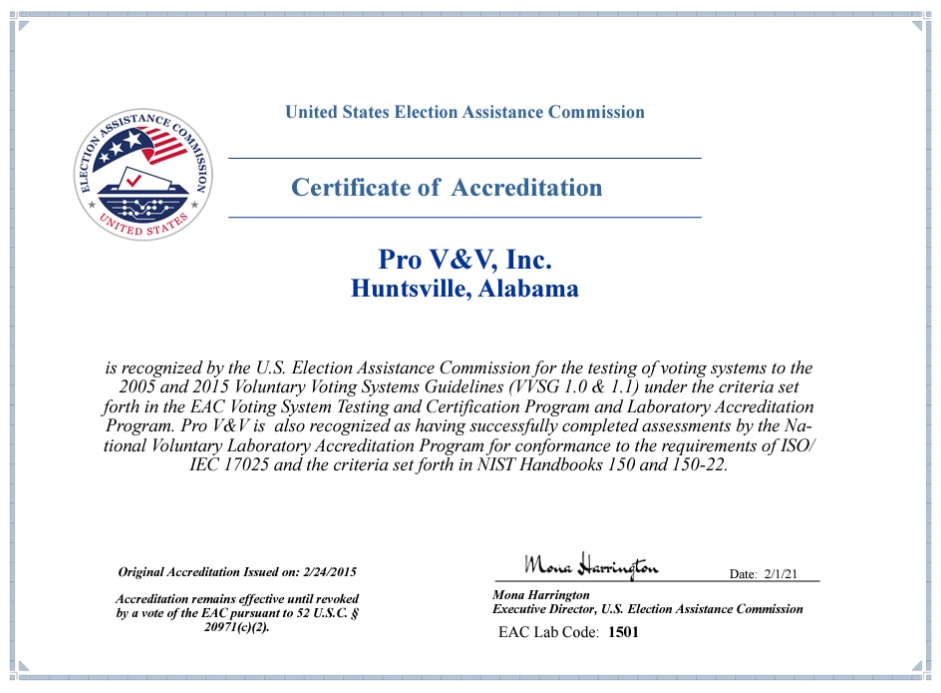Regardless, Pro V&V, according to the NVLAP and the EAC, was never out of compliance with standards and the lab’s accreditation was never in jeopardy. Clerical errors mixed with staffing cuts during a pandemic are all that are to blame for the certificate debacle. Elections were not affected and democracy was not threatened by this situation.
