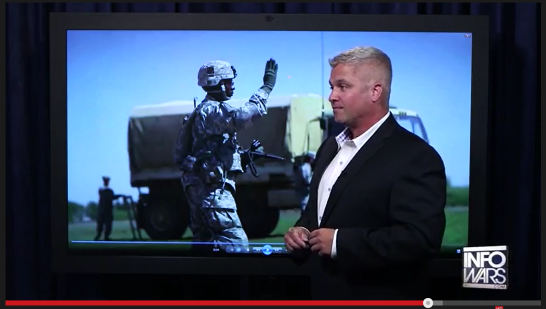 Now we get into the meat of the issue. You know, now that Biggs is on the scene. He explains that, oh my God, these are Active Duty Army units that are training for civil unrest. He and Jones also point out that these are WHITE soldiers detaining BLACK role-players.